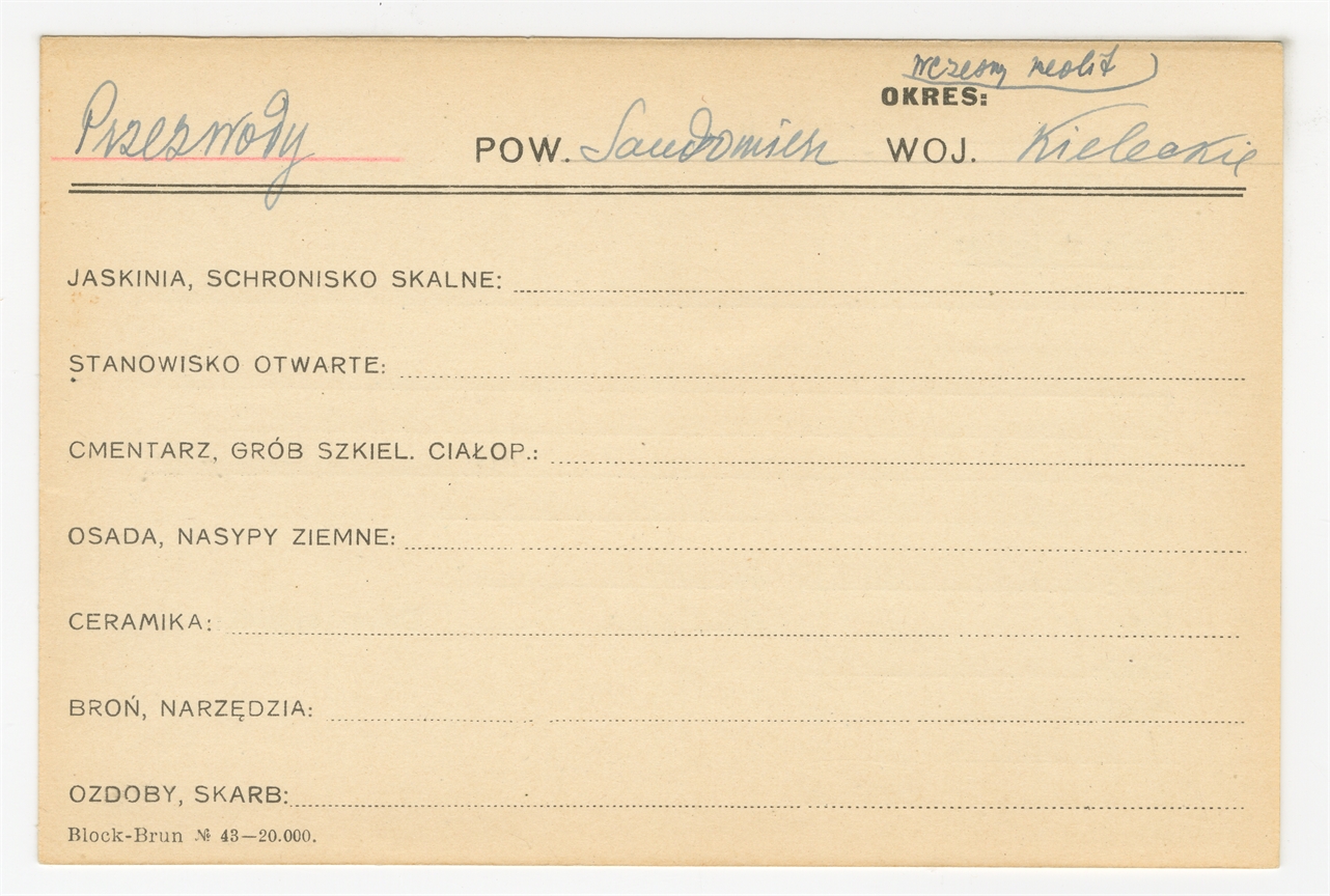Karta stanowiska "Przezwody pow. Sandomierze woj. Kieleckie" (druk rękopis) - strona 1