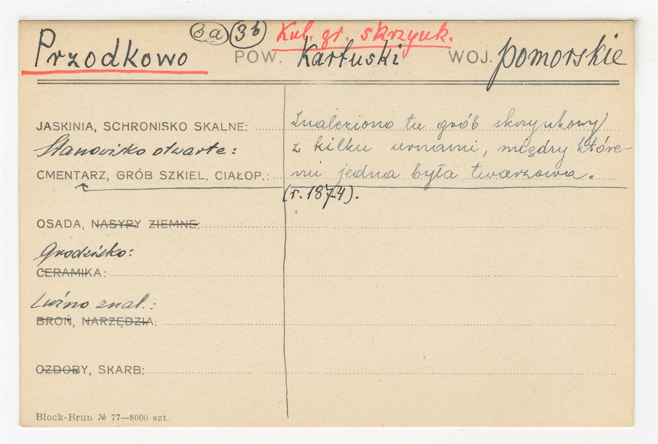 Karta stanowiska "Przodkowo pow. kartuski woj. pomorskie" (druk rękopis) - strona 1