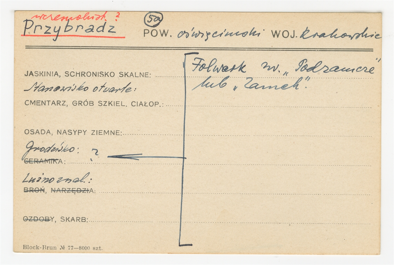 Karta stanowiska "Przybradz pow. oświęcimski woj. krakowskie" (druk rękopis) - strona 1