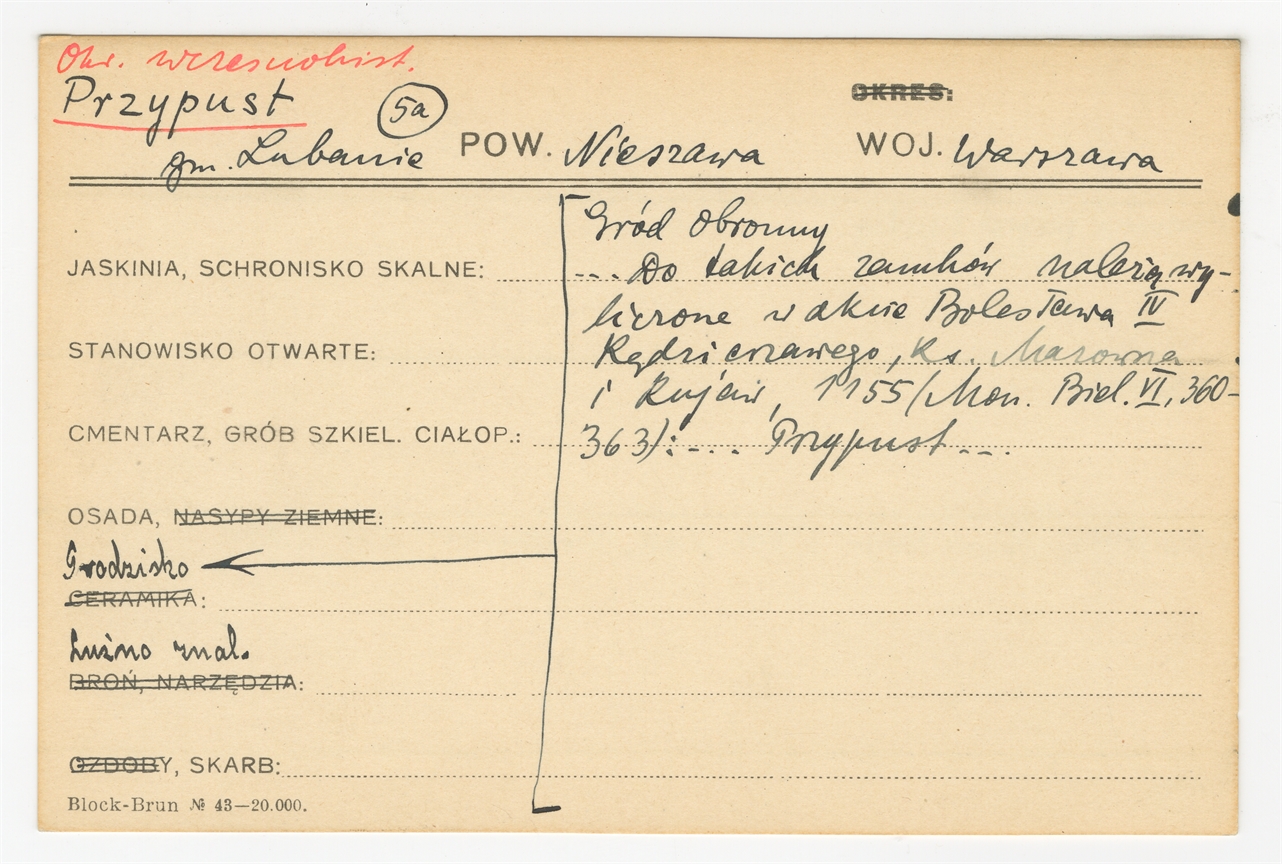 Karta stanowiska "Przypust gm Lubanie pow. Nieszawa woj. Warszawa" (druk rękopis) - strona 1