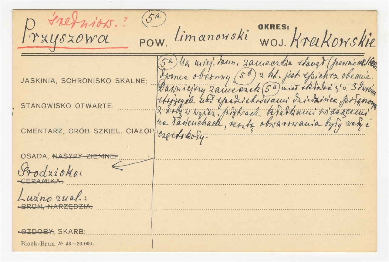 Karta stanowiska "Przyszowa pow. limanowski woj. Krakowskie" (druk rękopis) - strona 1