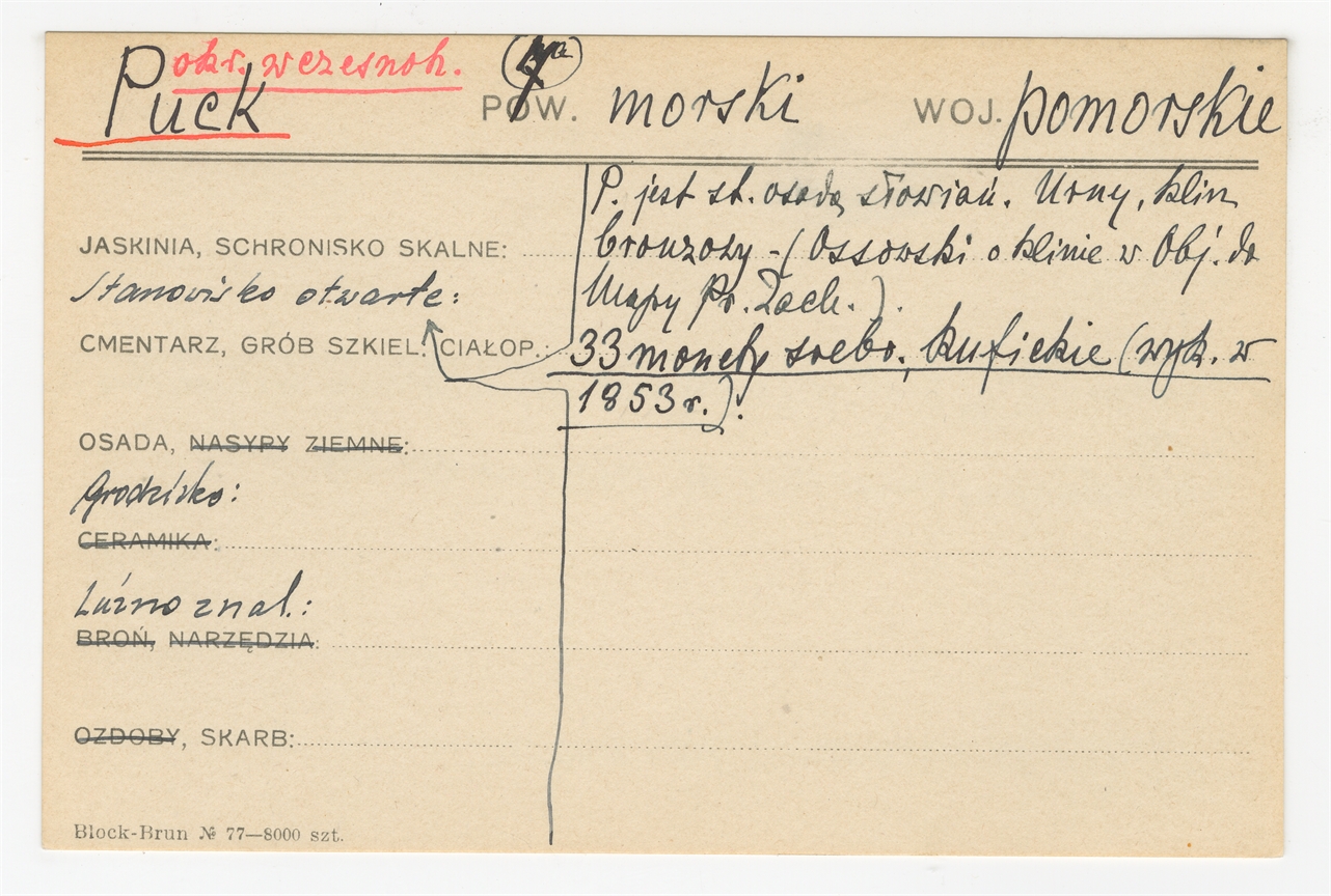 Karta stanowiska "Puck pow. morski woj. pomorskie" (druk rękopis) - strona 1