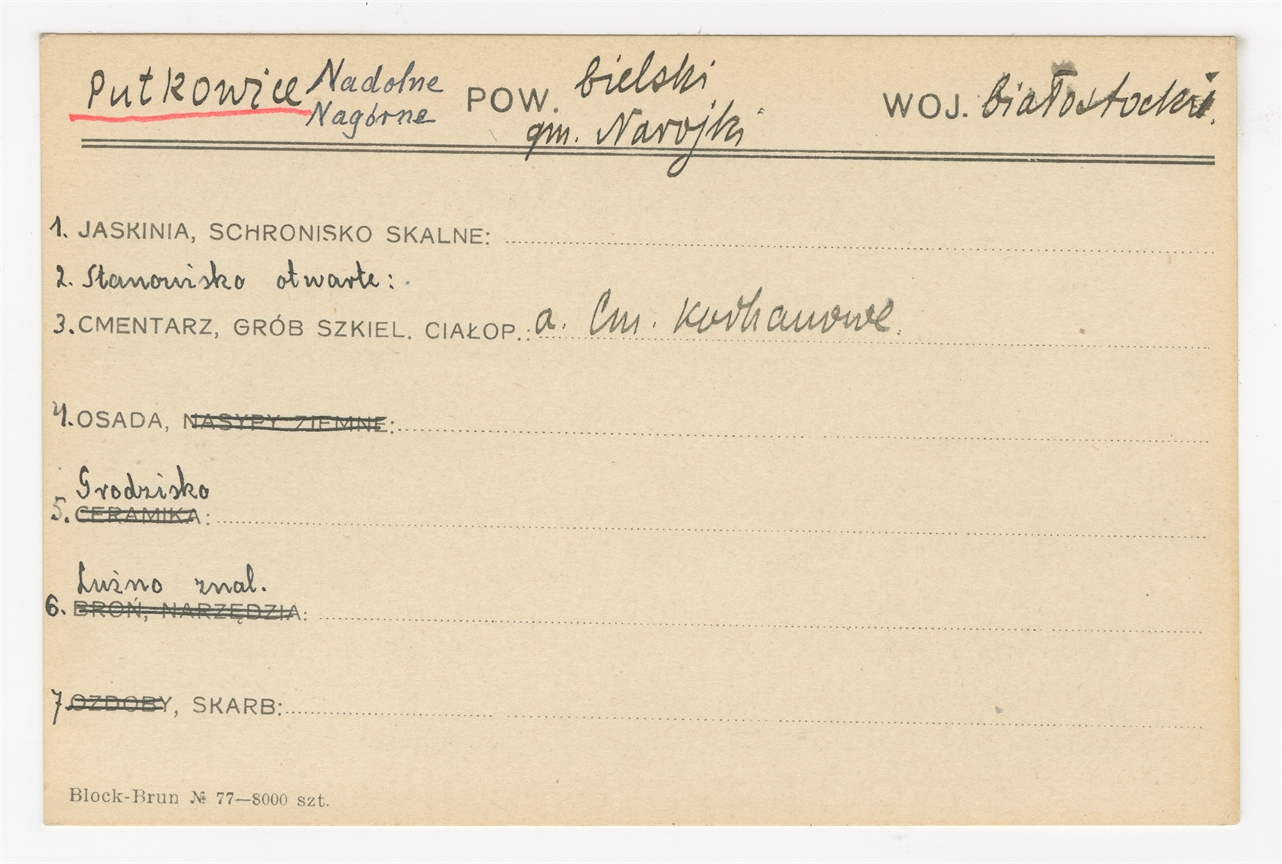Karta stanowiska "Putkowice (Nadolne Nagórne) gm. Narojki pow. bielski" (druk rękopis) - strona 1