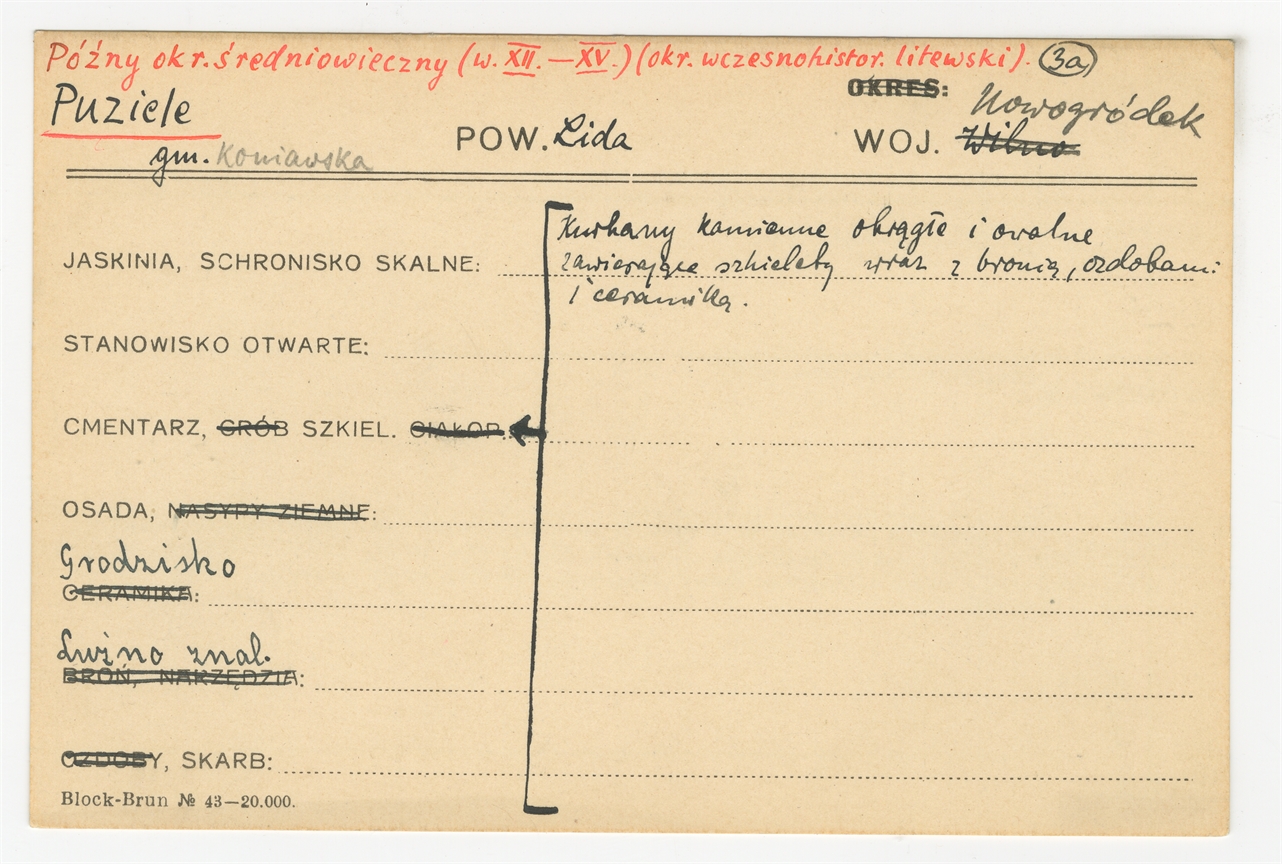 Karta stanowiska "Puziele gm. Koniawska pow. Lida woj. Wilno [skreślone] Nowogródek" (druk rękopis) - strona 1