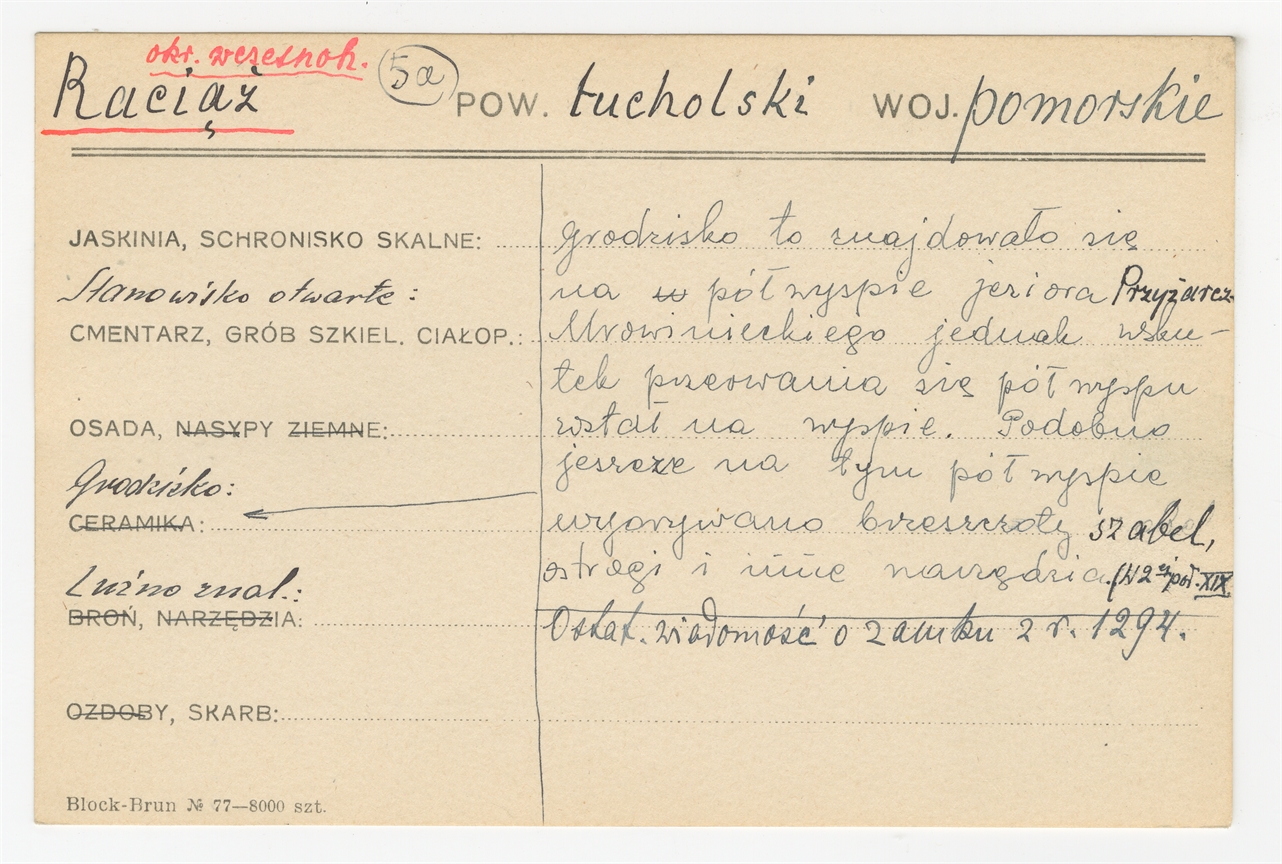 Karta stanowiska "Raciąż pow. tucholski woj. pomorskie" (druk rękopis) - strona 1