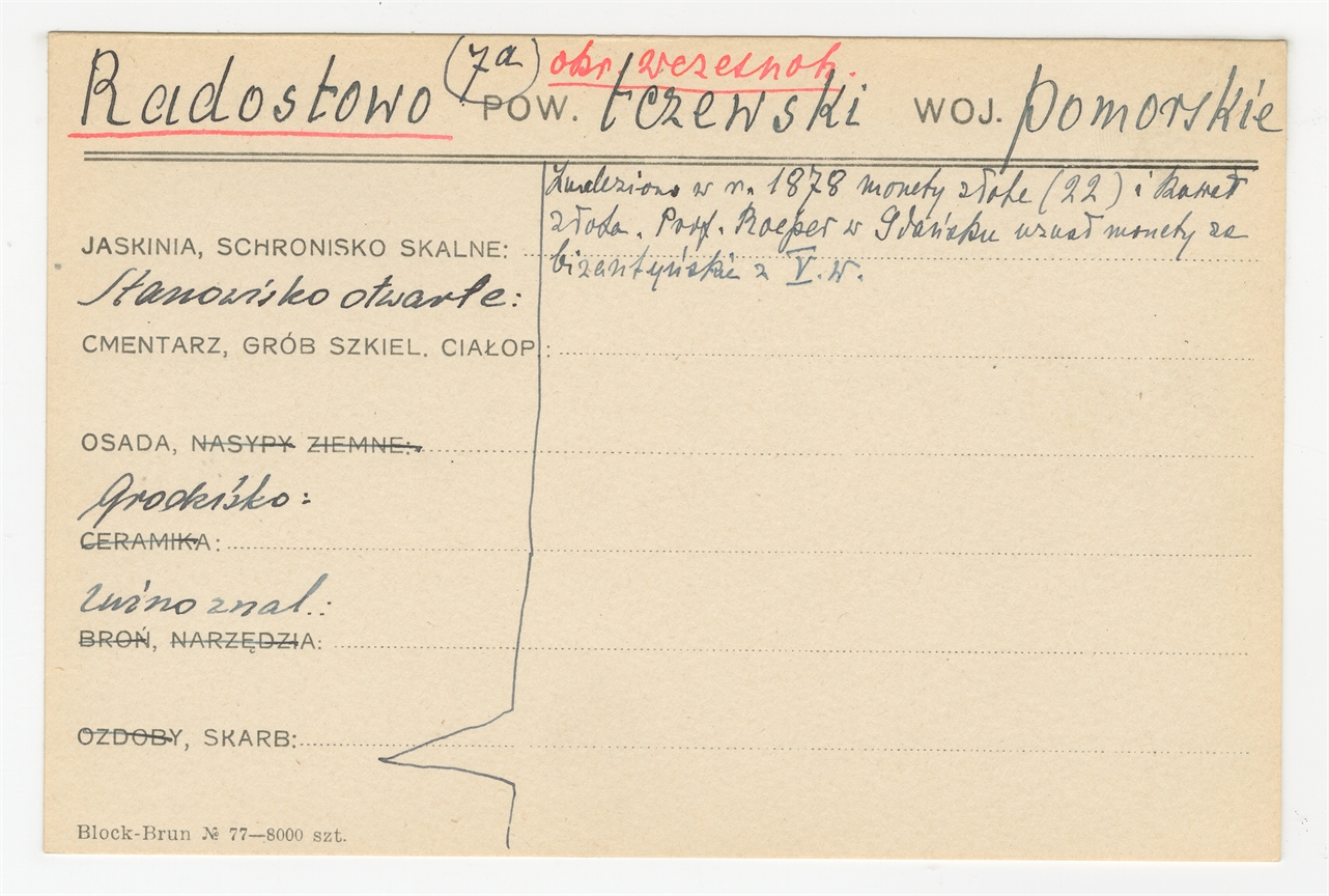 Karta stanowiska "Radostowo pow. tczewski woj. pomorskie" (druk rękopis) - strona 1