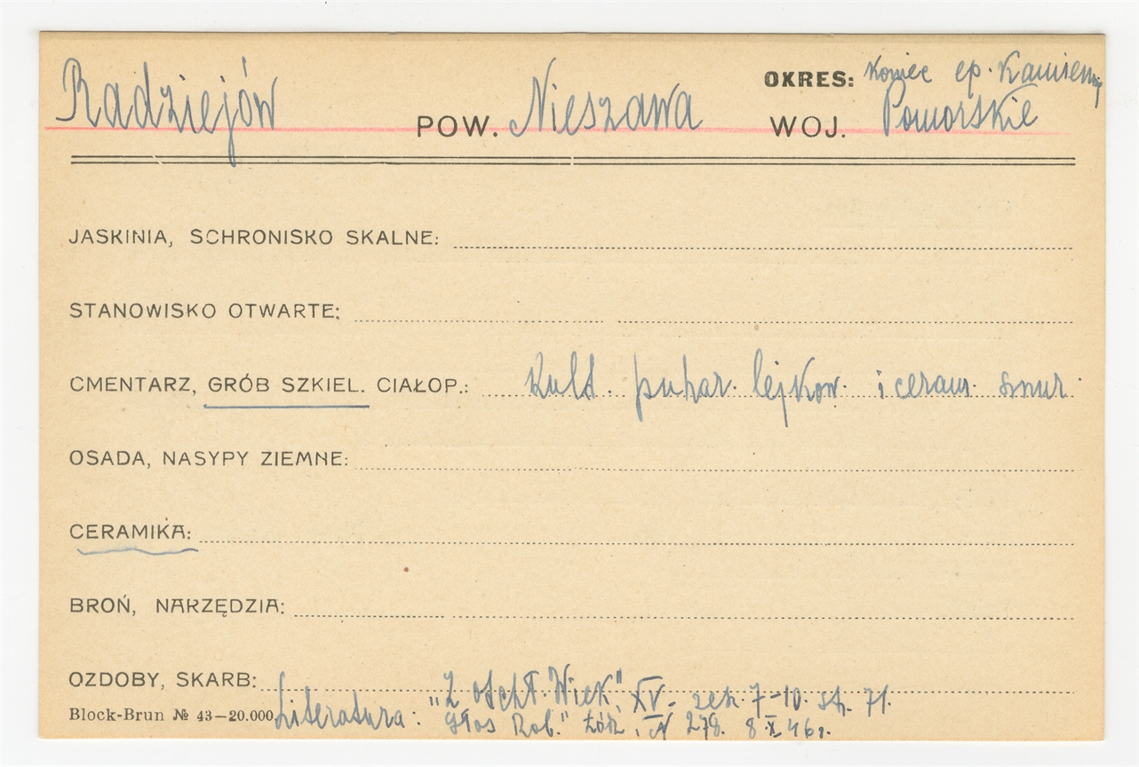 Element 1 - Karta stanowiska "Radziejów gm. Nieszawa woj. Pomorskie" (druk rękopis) - strona 1