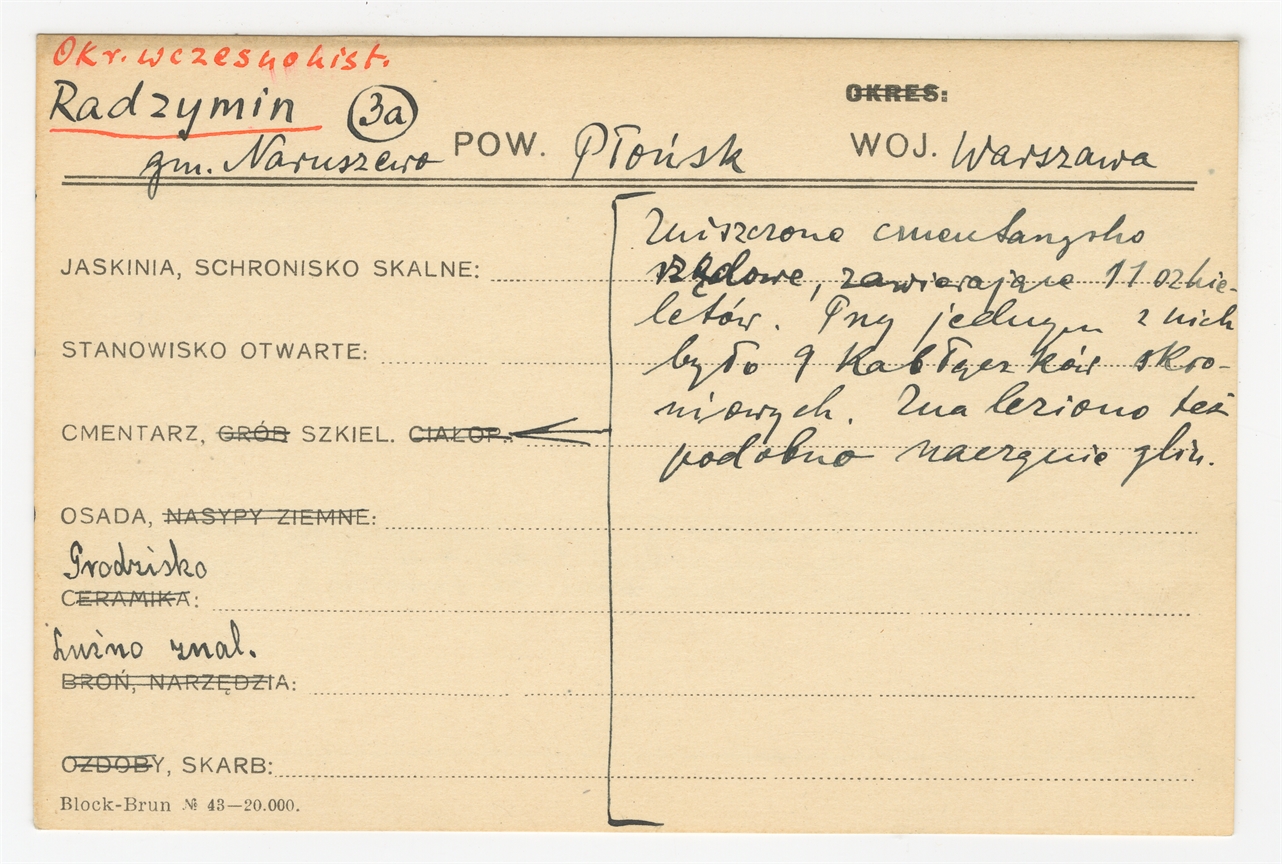 Karta stanowiska "Radzymin gm. Naruszewo pow. Płońsk woj. Warszawa" (druk rękopis) - strona 1