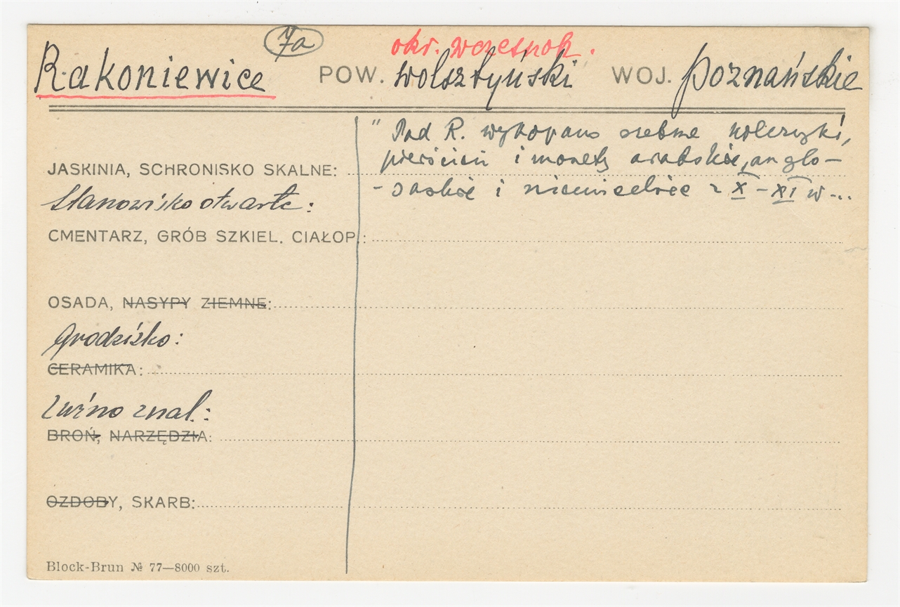 Karta stanowiska "Rakoniewice pow. wolsztyński woj. poznańskie" (druk rękopis) - strona 1