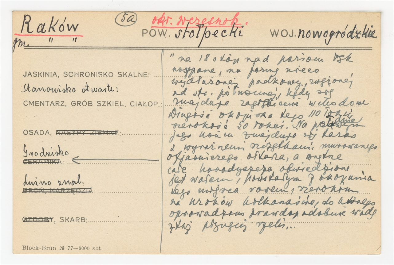Karta stanowiska "Raków gm. Raków pow. stołpecki woj. nowogródzkie" (druk rękopis) - strona 1
