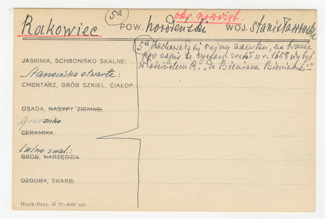 Karta stanowiska "Rakowiec pow. horodeński woj. stanisławowskie" (druk rękopis) - strona 1