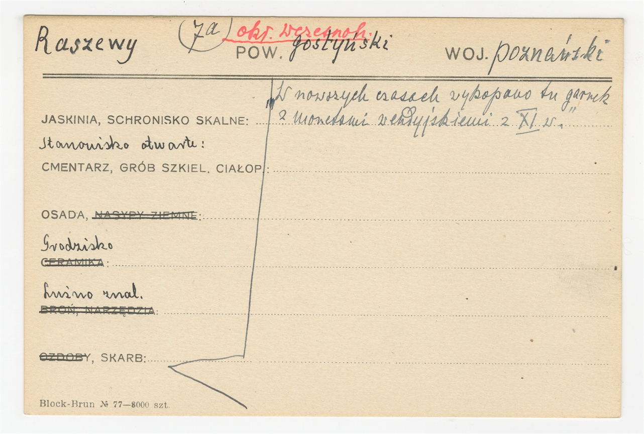 Karta stanowiska "Raszewy pow. gostyński woj. poznańskie" (druk rękopis) - strona 1