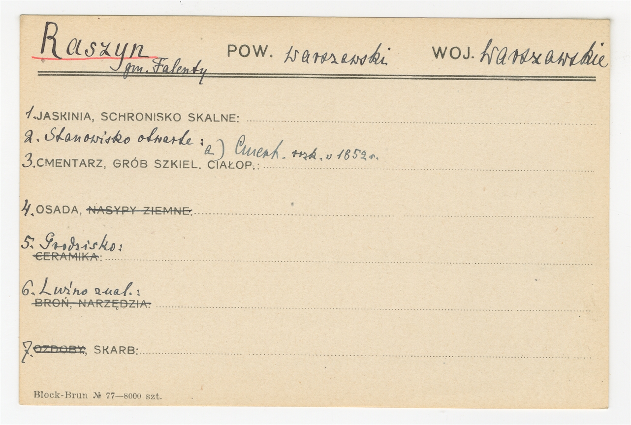 Element 1 - Karta stanowiska "Raszyn gm. Falenty pow. Warszawski" (druk rękopis) - strona 1