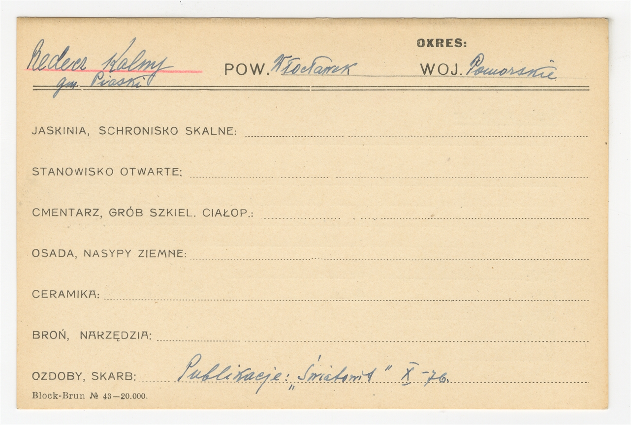 Karta stanowiska "Redecz Kalny gm. Piaski pow. Włocławek woj. Pomorskie" (druk rękopis) - strona 1