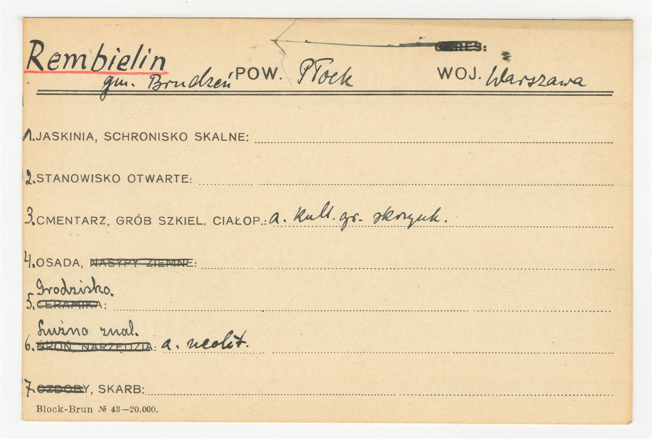 Karta stanowiska "Rembielin gm. Brudzeń pow. Płock woj. Warszawa" (druk rękopis) - strona 1