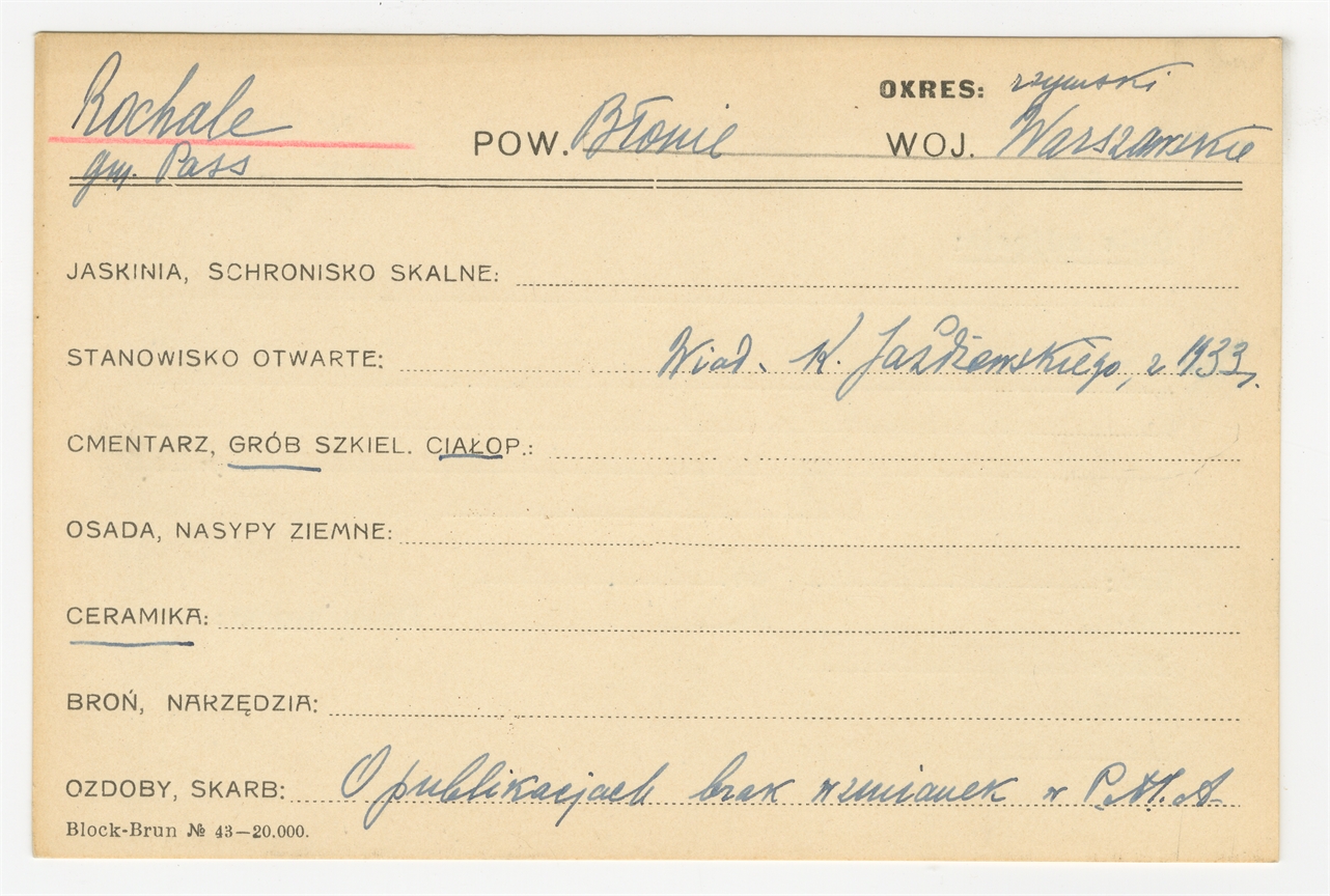 Karta stanowiska "Rochale gm. Pass pow. Błonie woj. Warszawskie" (druk rękopis) - strona 1