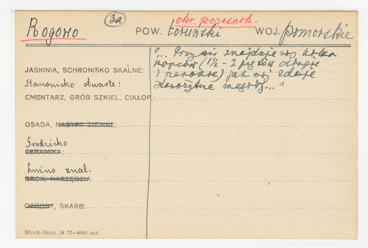 Karta stanowiska "Rogowo pow. toruński woj. pomorskie" (druk rękopis) - strona 1
