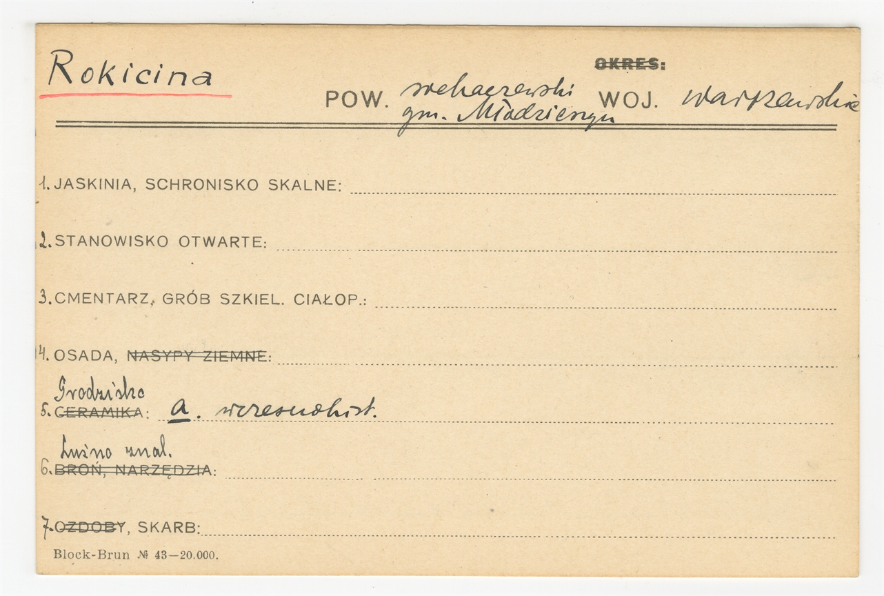 Karta stanowiska "Rokicina gm. Młodzieszyn pow. sochaczewski woj. warszawskie" (druk rękopis) - strona 1