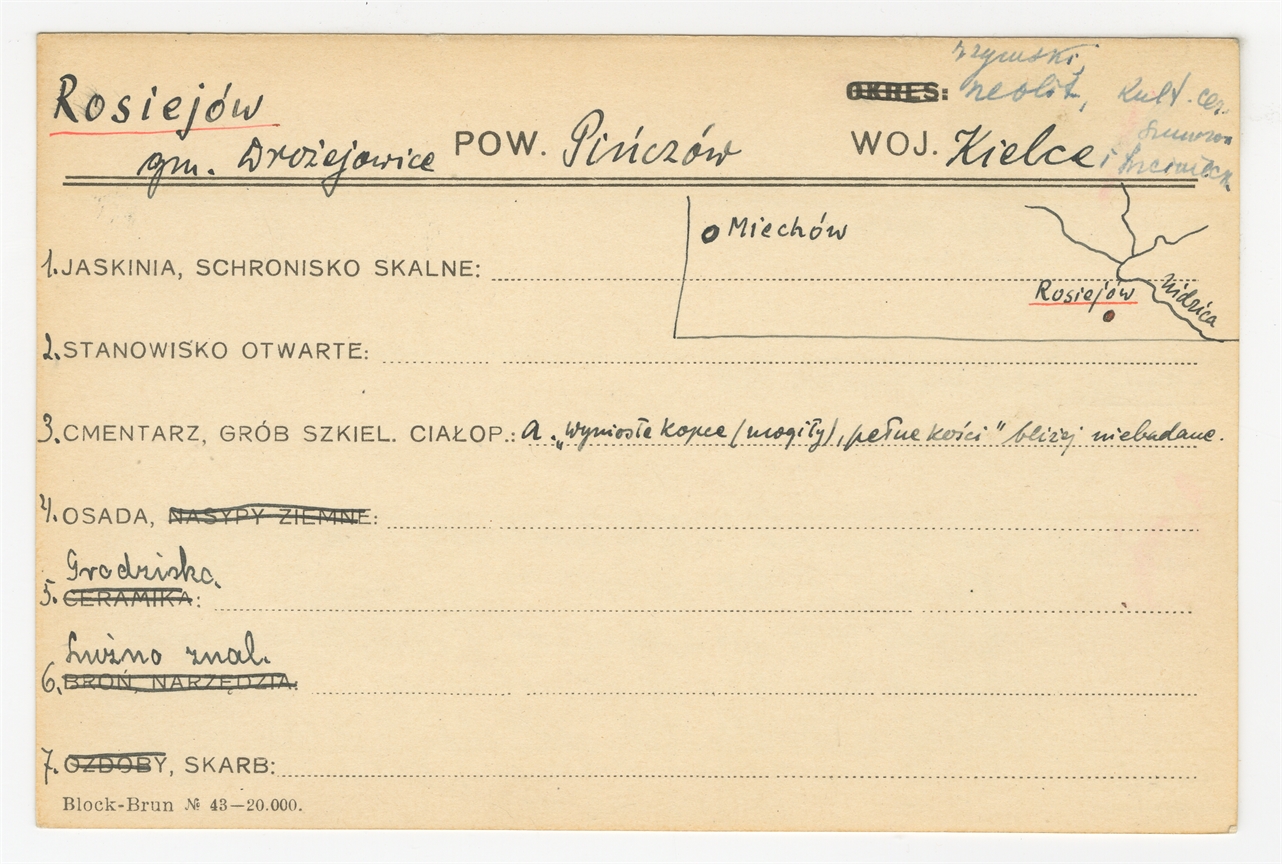 Karta stanowiska "Rosiejów gm. Wrożejowice pow. Pińczów woj. Kielce" (druk rękopis) - strona 1