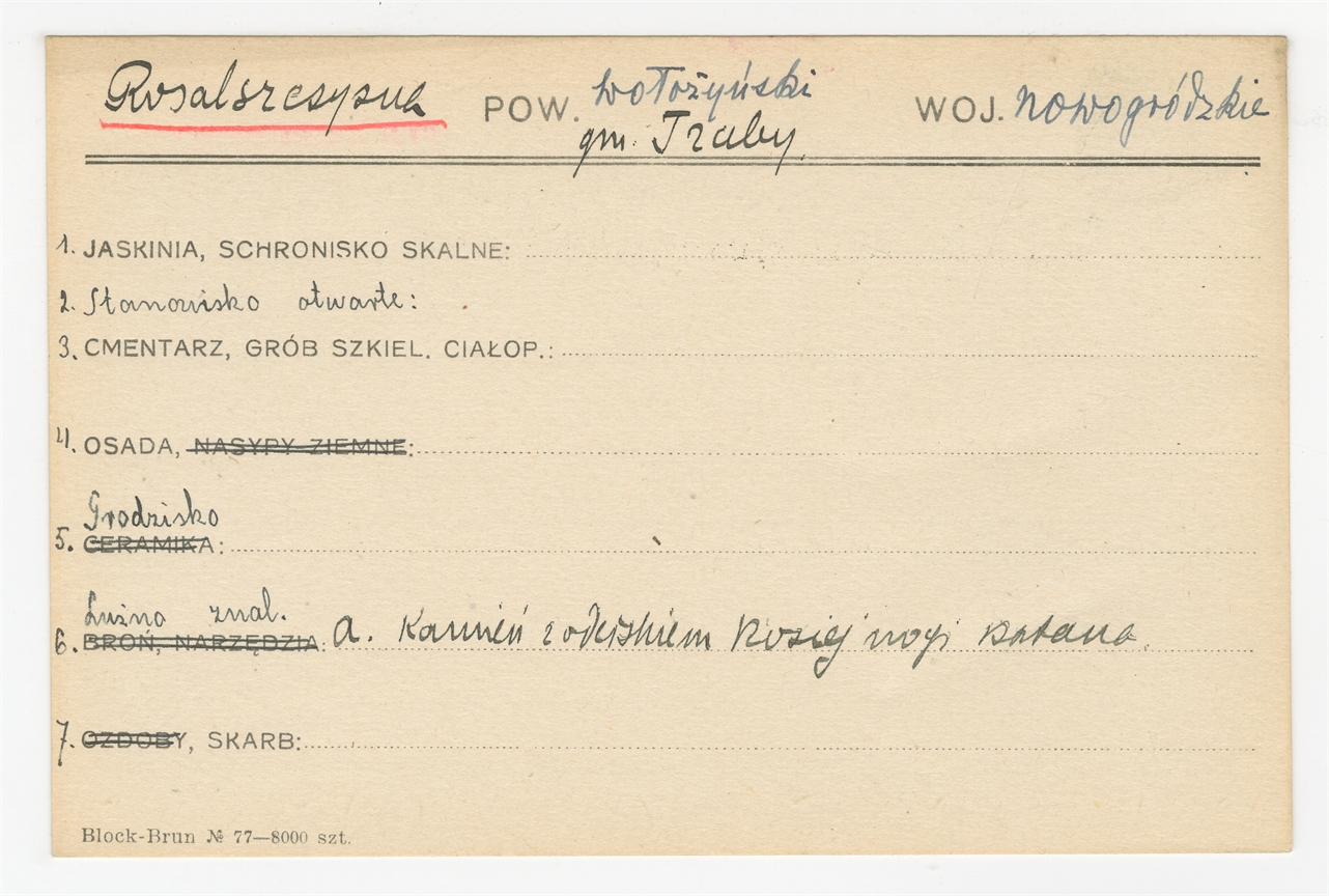 Karta stanowiska "Rosulszczyzna gm. Traby pow. wołożyński woj. nowogródzkie" (druk rękopis) - strona 1