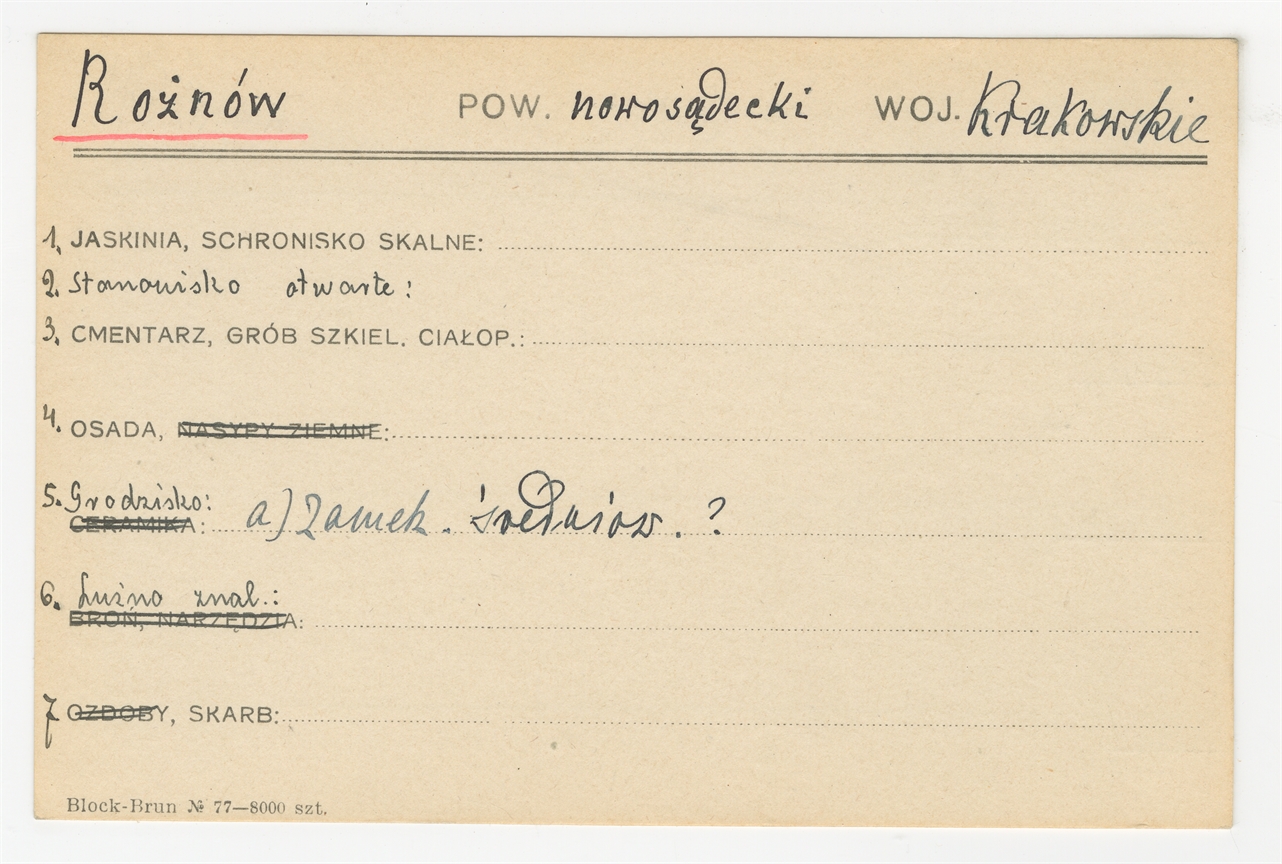 Karta stanowiska "Rożnów pow. nowosądecki woj. Krakowskie" (druk rękopis) - strona 1