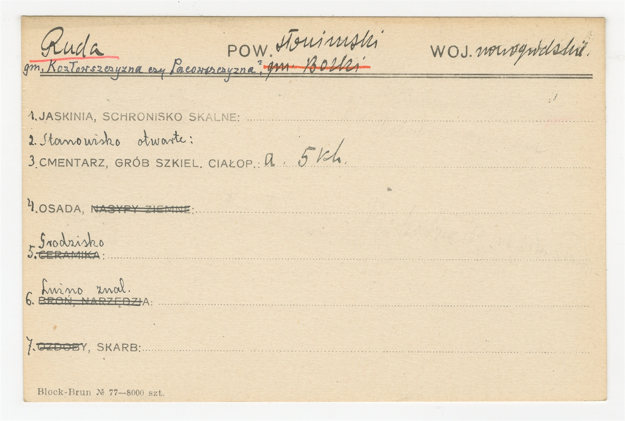 Karta stanowiska "Ruda gm. Borki [skreślone] Kozłowszczyzna czy Pacowszczyzna? woj. nowogródzkie" (druk rękopis) - strona 1