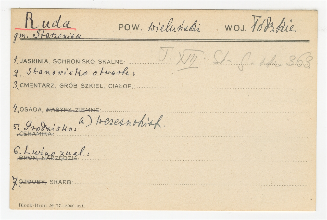 Element 1 - Karta stanowiska "Ruda gm. Starzenica pow. wieluński woj. łódzkie" (druk rękopis) - strona 1