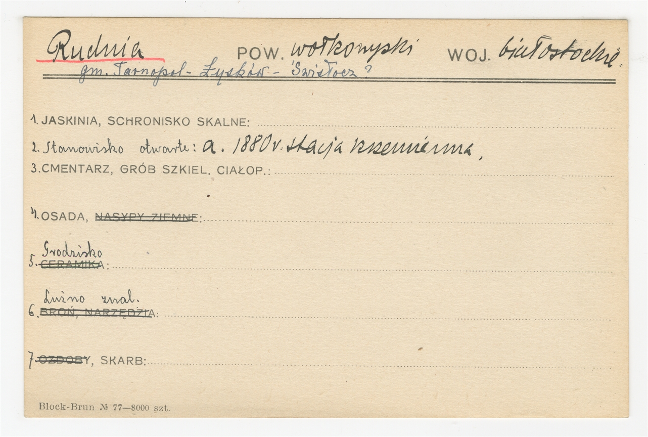 Karta stanowiska "Rudnia gm. Tarnopol-Łyszków - Świałocz? pow. wołkowyski woj. białostockie" (druk rękopis) - strona 1