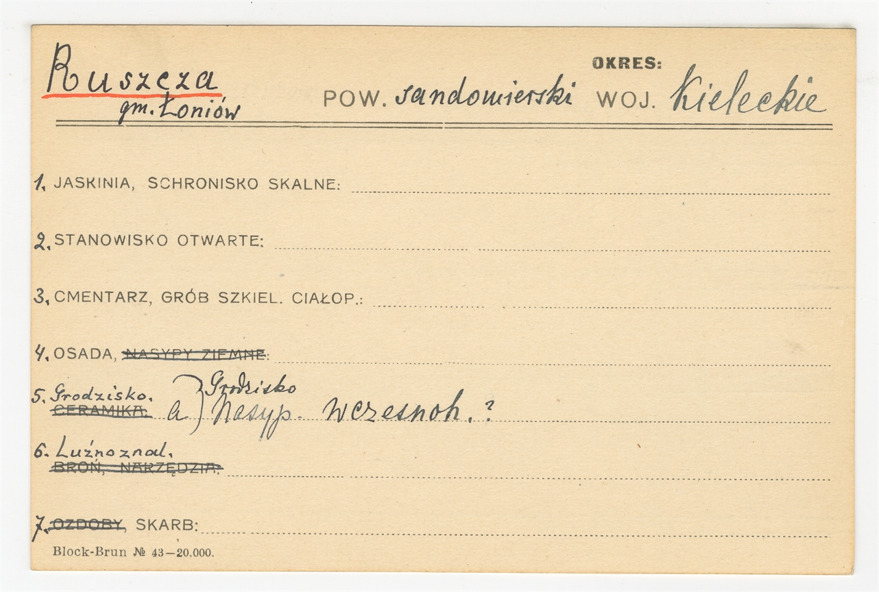 Karta stanowiska "Ruszcza gm. Łoniów pow. sandomierski woj. kieleckie" (druk rękopis) - strona 1