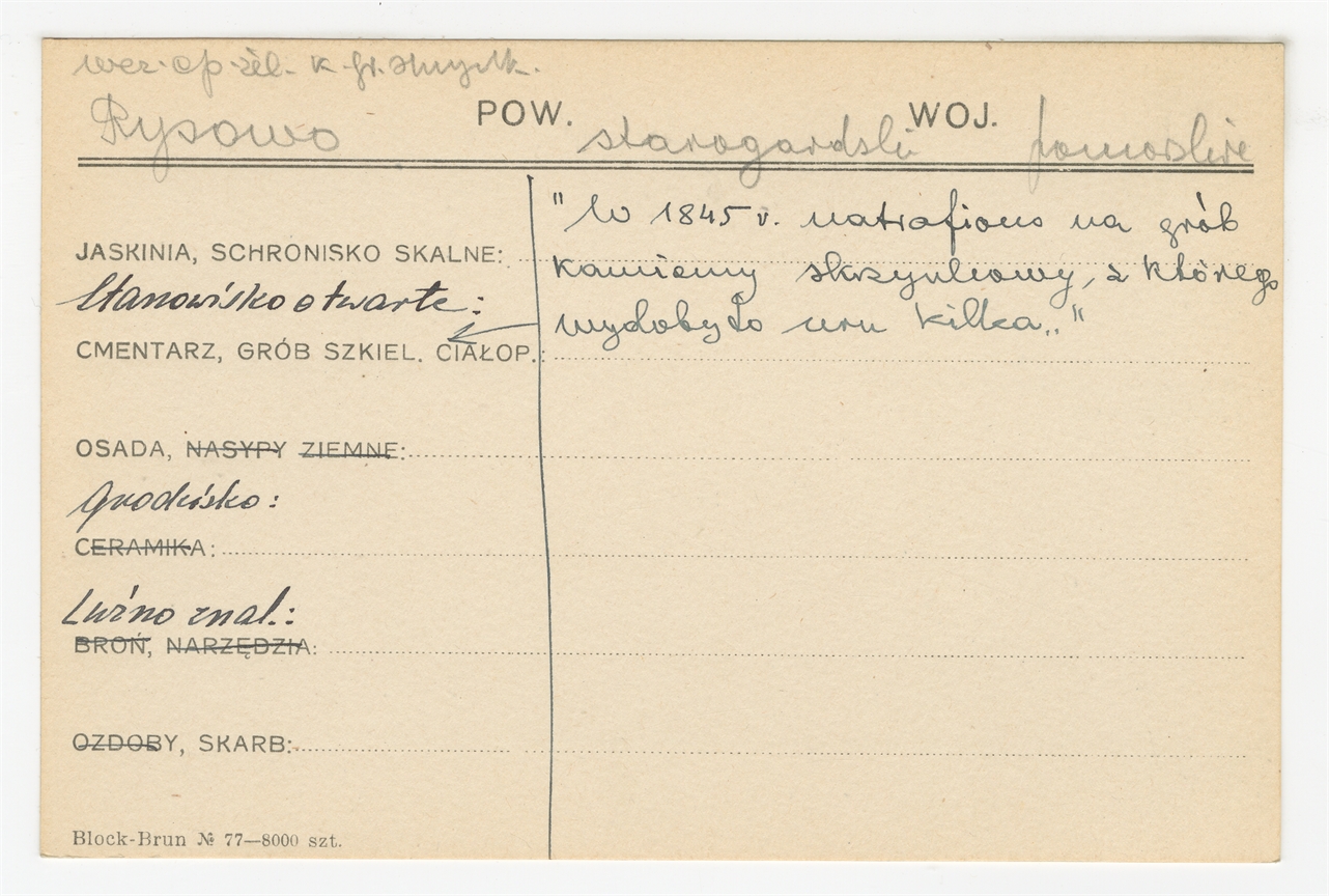 Karta stanowiska "Rysowo pow. starogardzki woj. pomorskie" (druk rękopis) - strona 1