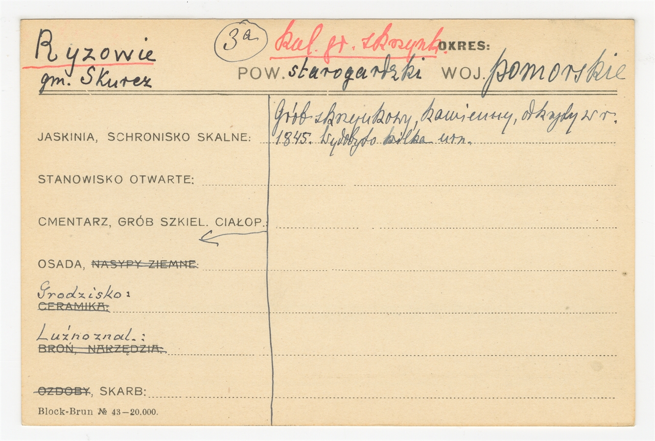 Karta stanowiska "Ryzowie gm. Skurcz pow. starogardzki woj. pomorskie" (druk rękopis) - strona 1
