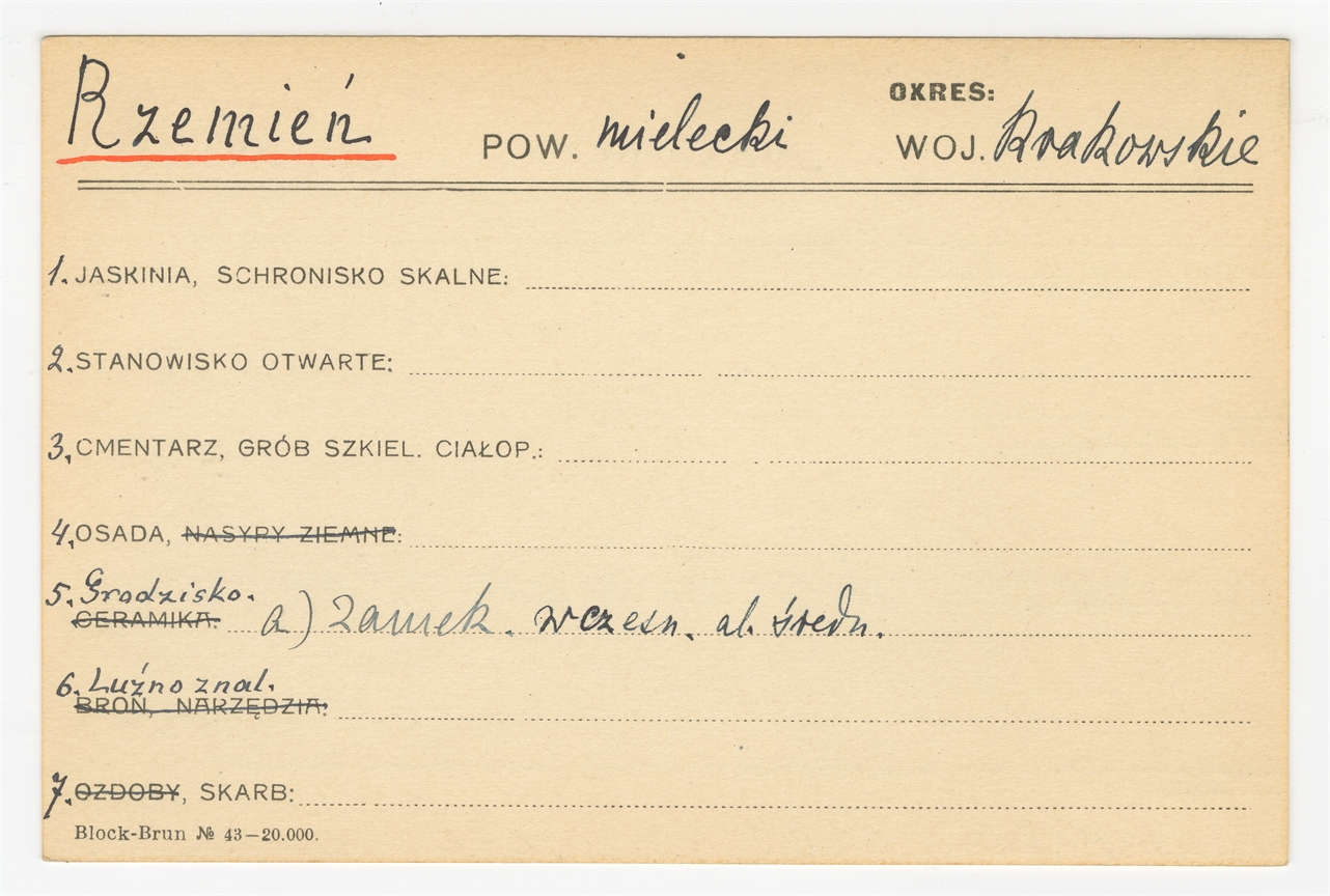 Karta stanowiska "Rzemień pow. mielecki woj. Krakowskie" (druk rękopis) - strona 1