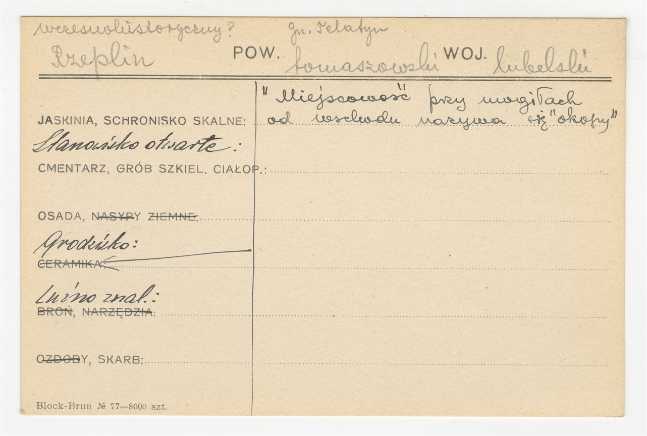Karta stanowiska "Rzeplin gm. Felatyn pow. tomaszowski woj. lubelskie" (druk rękopis) - strona 1