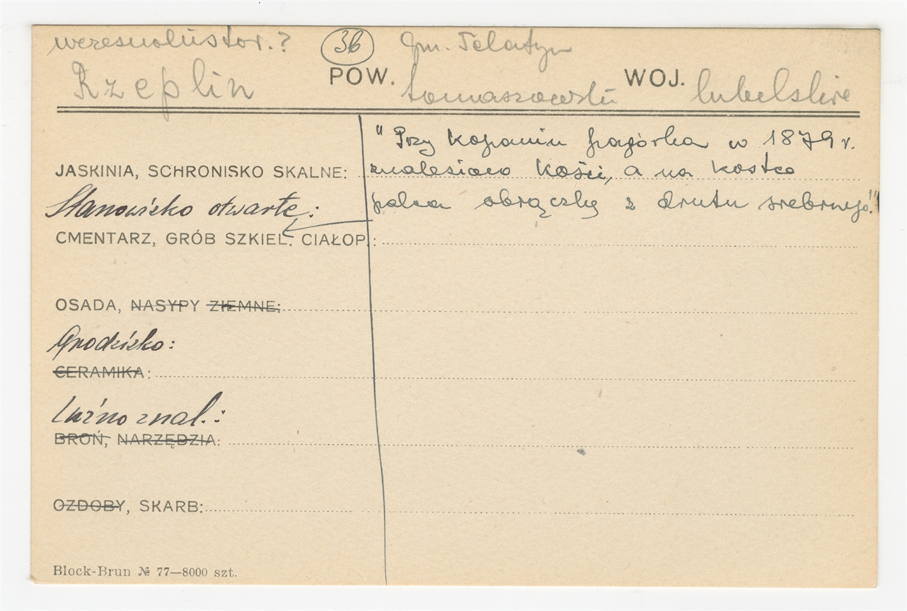 Karta stanowiska "Rzeplin gm. Felatyn pow. tomaszowski woj. lubelskie" (druk rękopis) - strona 1
