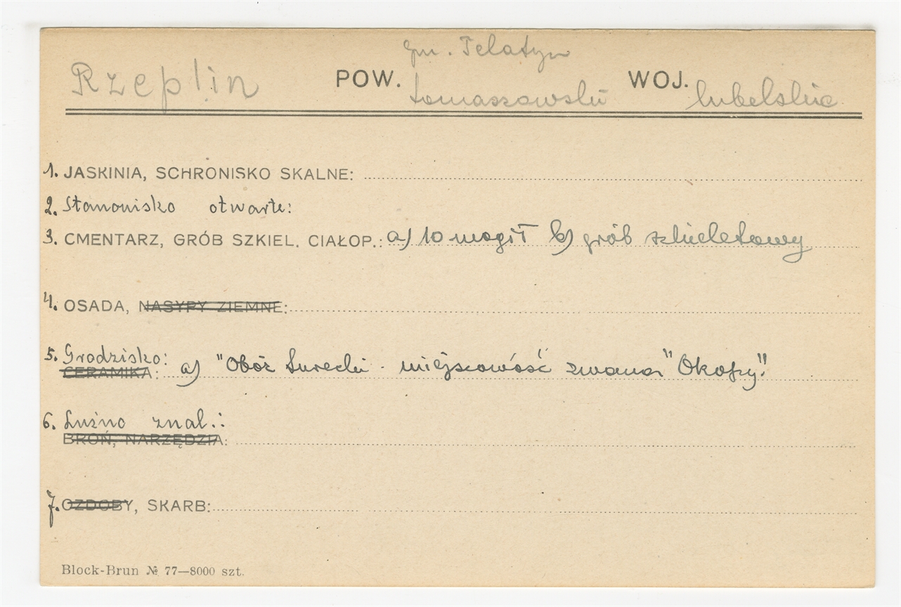 Element 1 - Karta stanowiska "Rzeplin gm. Felatyn pow. tomaszowski woj. lubelskie" (druk rękopis) - strona 1