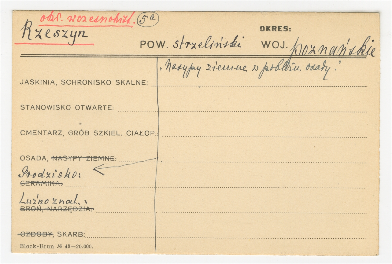 Karta stanowiska "Rzeszyn pow. strzeliński woj. poznańskie" (druk rękopis) - strona 1