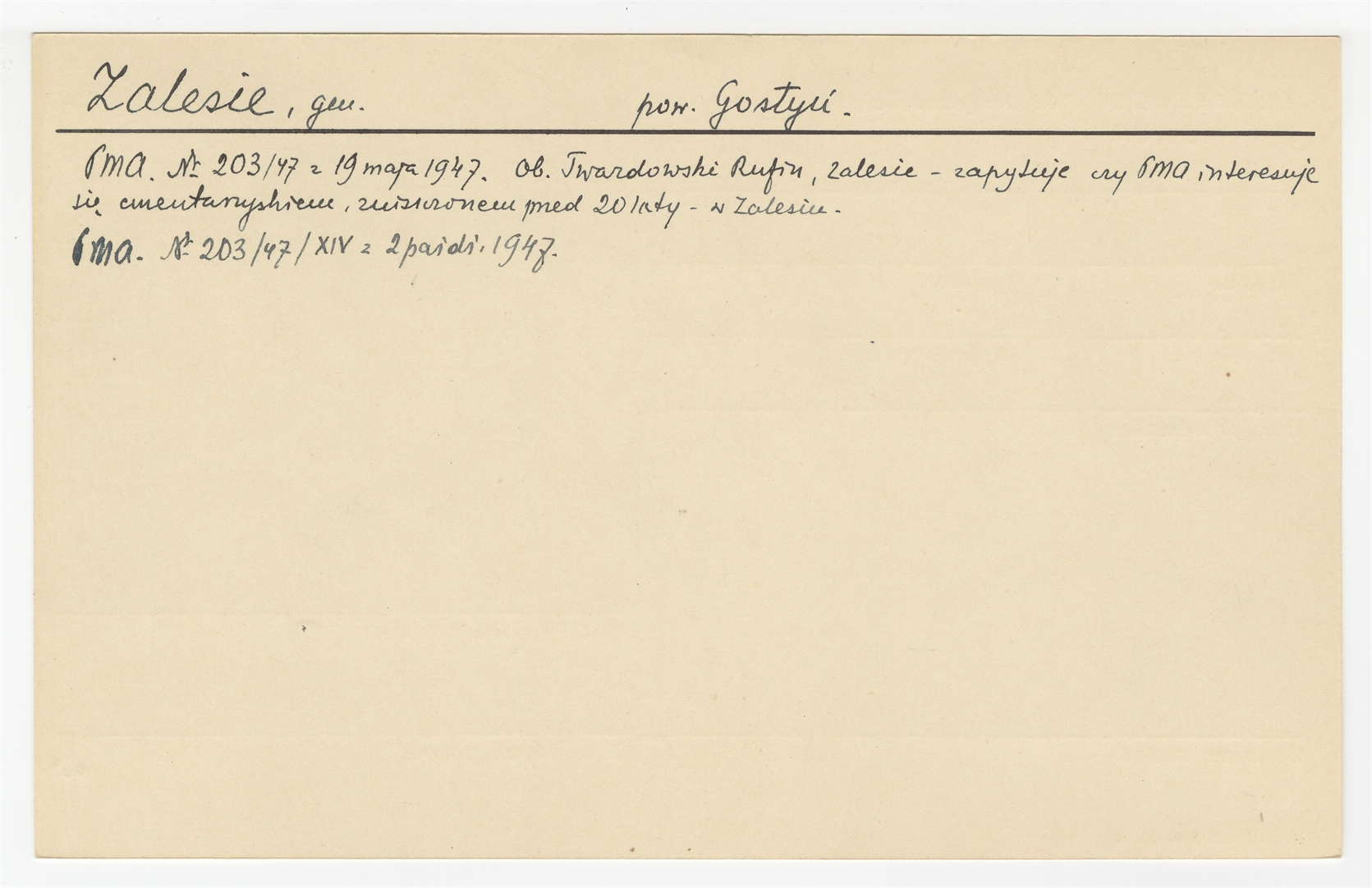 Karta "Zalesie gm. [brak danych] pow. Gostyń" (rękopis) z kartoteki Michała Drewki dotyczącej jego działalności konserwatorskiej - strona 1