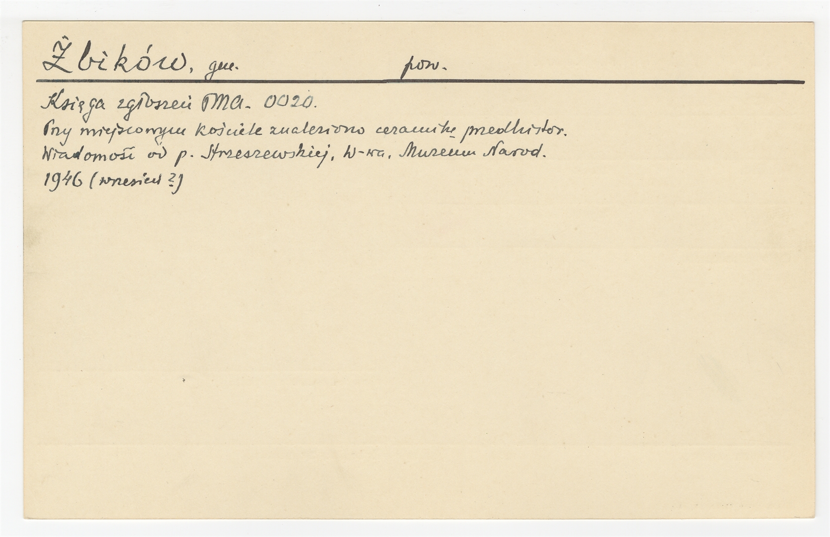 Karta "Żbików" (rękopis) z kartoteki Michała Drewki dotyczącej jego działalności konserwatorskiej - strona 1