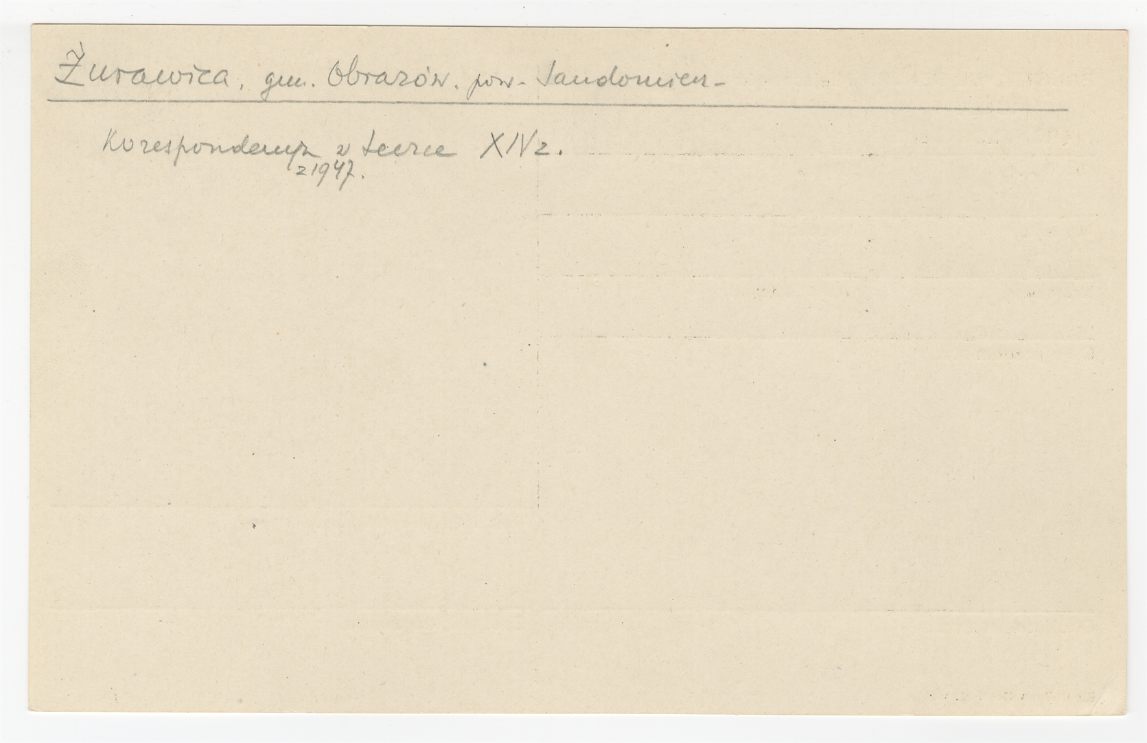 Karta "Żurawica gm. Obrazów pow. Sandomierz" (rękopis) z kartoteki Michała Drewki dotyczącej jego działalności konserwatorskiej - strona 1: "Korespondencja z 1947 w teczce XIVz"