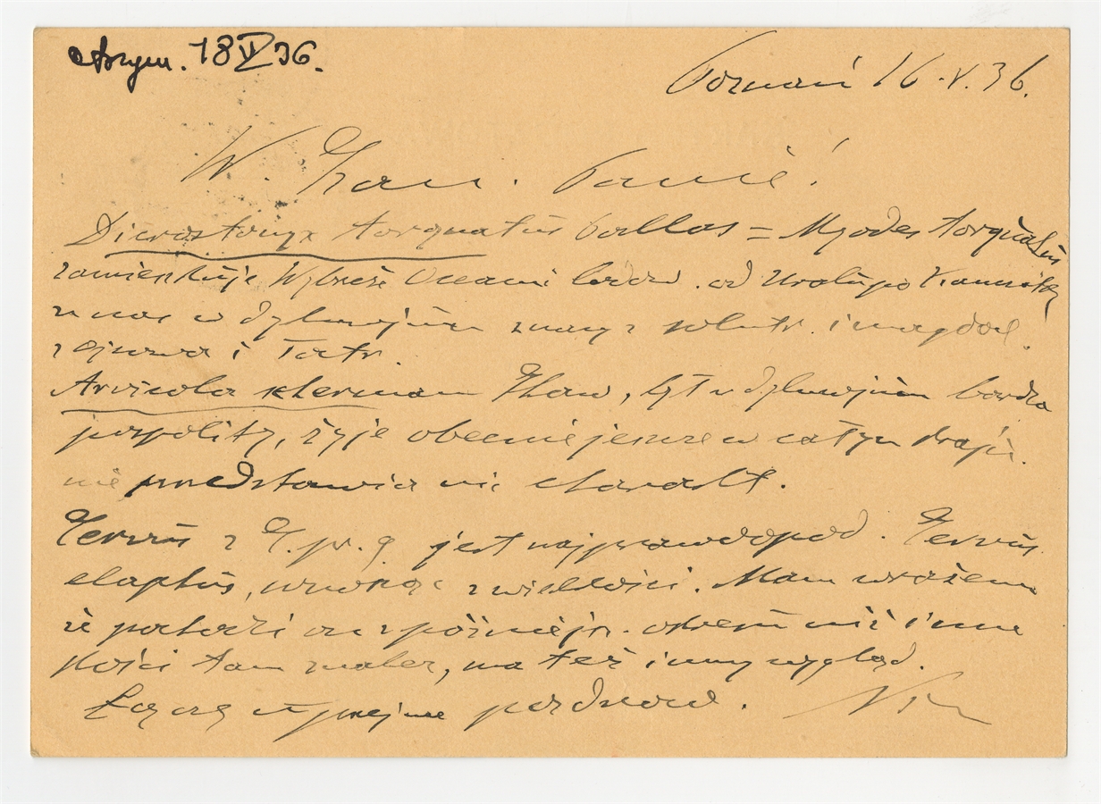 Kartka pocztowa (awers) - list napisany przez prof. dr E. Niezabitowskiego do prof. Stefana Krukowskiego 16 V [19]36 r.