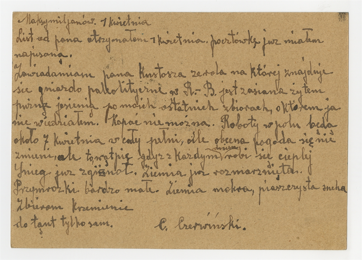 Kartka pocztowa do prof. Stefana Krukowskiego od C. Czerwińskiego Maksymilianów 1 IV 1932 r. - rewers