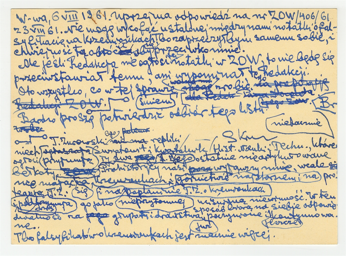 Kartka pocztowa (kopia) od Stefana Krukowskiego do Bogdana Kostrzewskiego redaktora ZOW z dnia 6 VIII 1961 roku - rewers