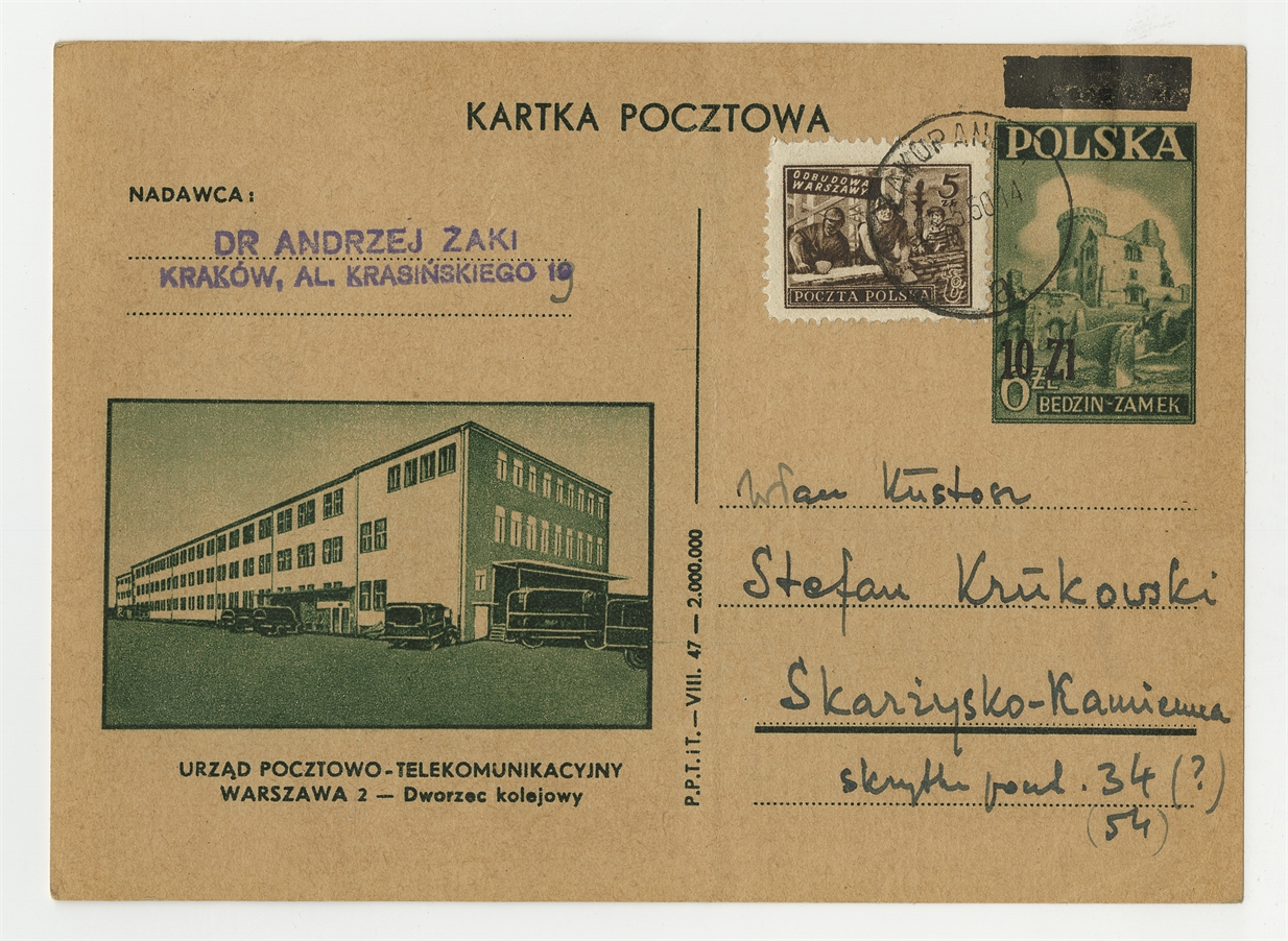 Kartka pocztowa od Andrzeja Żaki do Stefana Krukowskiego z dnia 22 V 1950 roku - awers