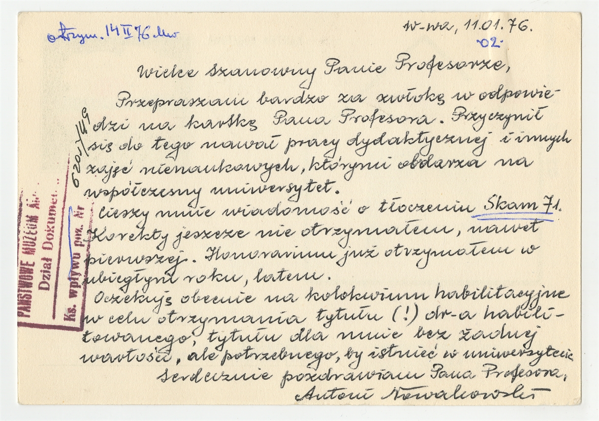 Kartka pocztowa od Antoniego Nowakowskiego do Stefana Krukowskiego z dn. 11 I [19]76 r. - rewers