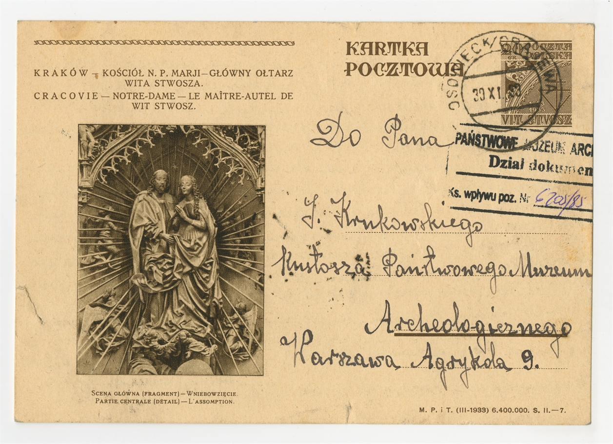 Kartka pocztowa od C. Czerwińskiego do prof. Stefana Krukowskiego Osowiec 29 XI 1933r. - awers