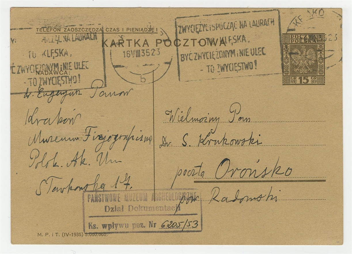 Kartka pocztowa od Eugeniusza Panera do Stefana Krukowskiego z dnia 16 VIII 1935 roku - awers
