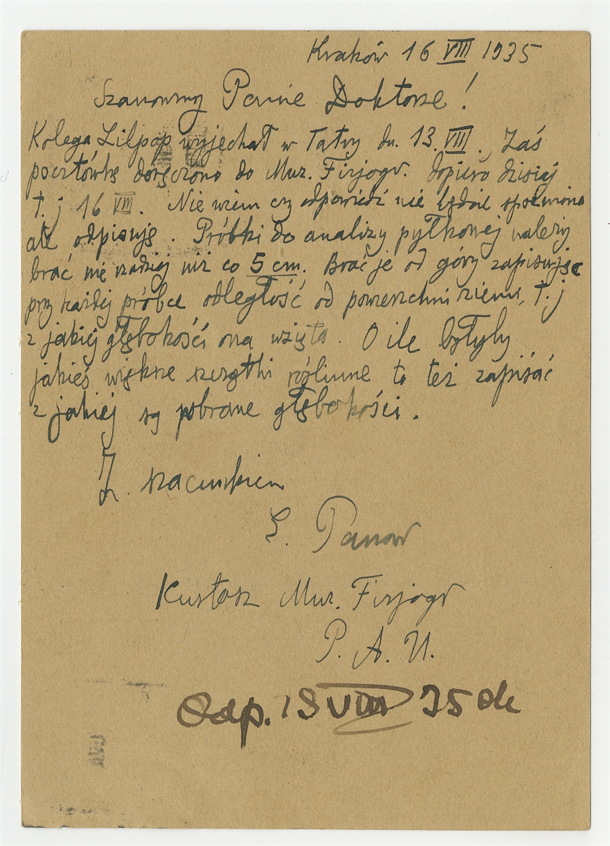 Kartka pocztowa od Eugeniusza Panera do Stefana Krukowskiego z dnia 16 VIII 1935 roku - rewers