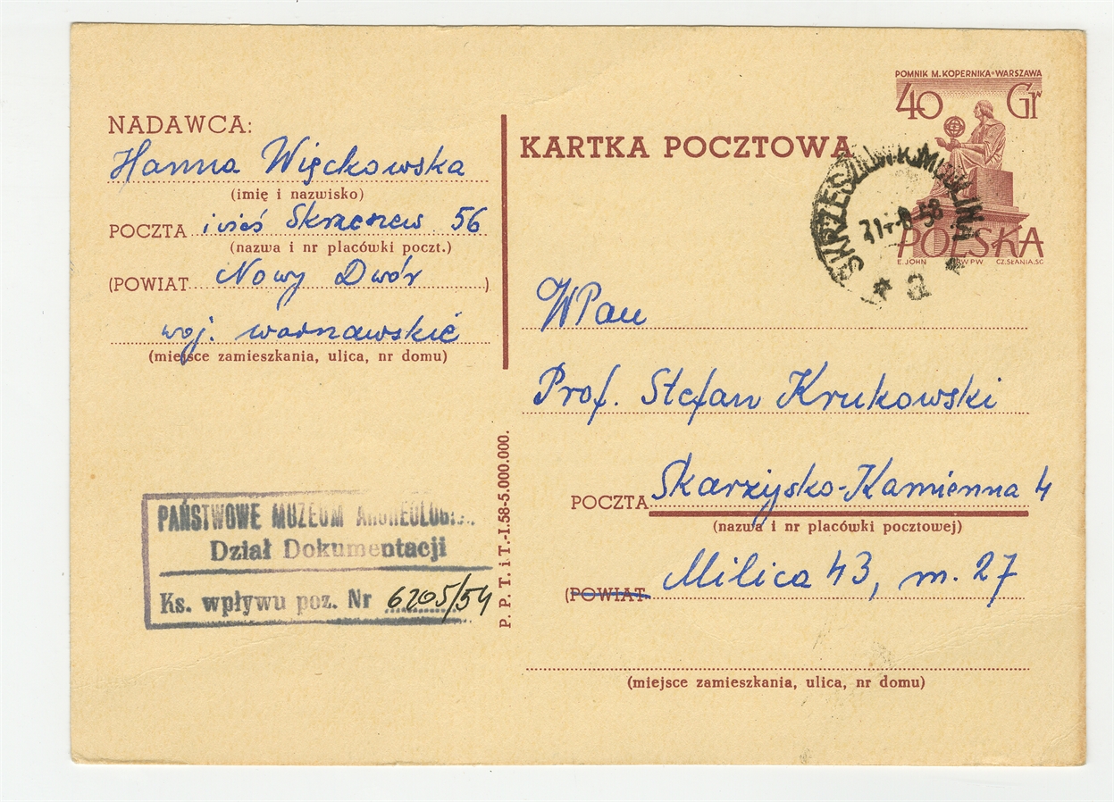 Kartka pocztowa od Hanny Więckowskiej do Stefana Krukowskiego z dnia 19 VIII [19]58 roku - awers
