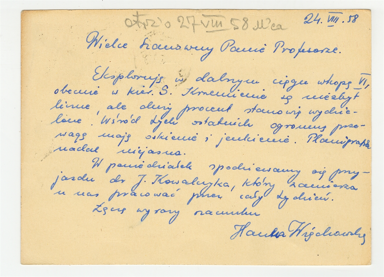 Kartka pocztowa od Hanny Więckowskiej do Stefana Krukowskiego z dnia 24 VIII [19]58 roku - rewers
