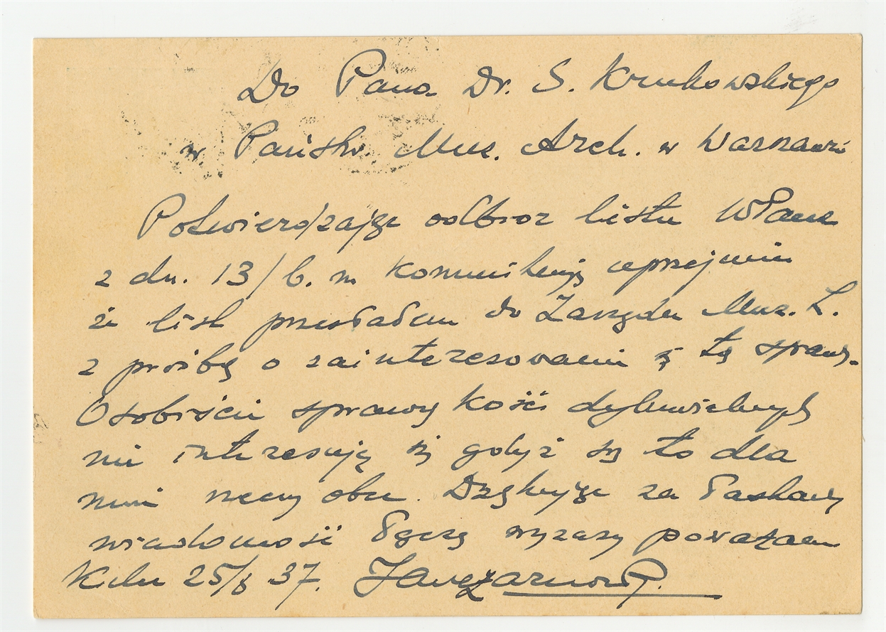 Kartka pocztowa od Jana Czarnockiego do Stefana Krukowskiego z dn. 25 VIII [19]37 r. - rewers